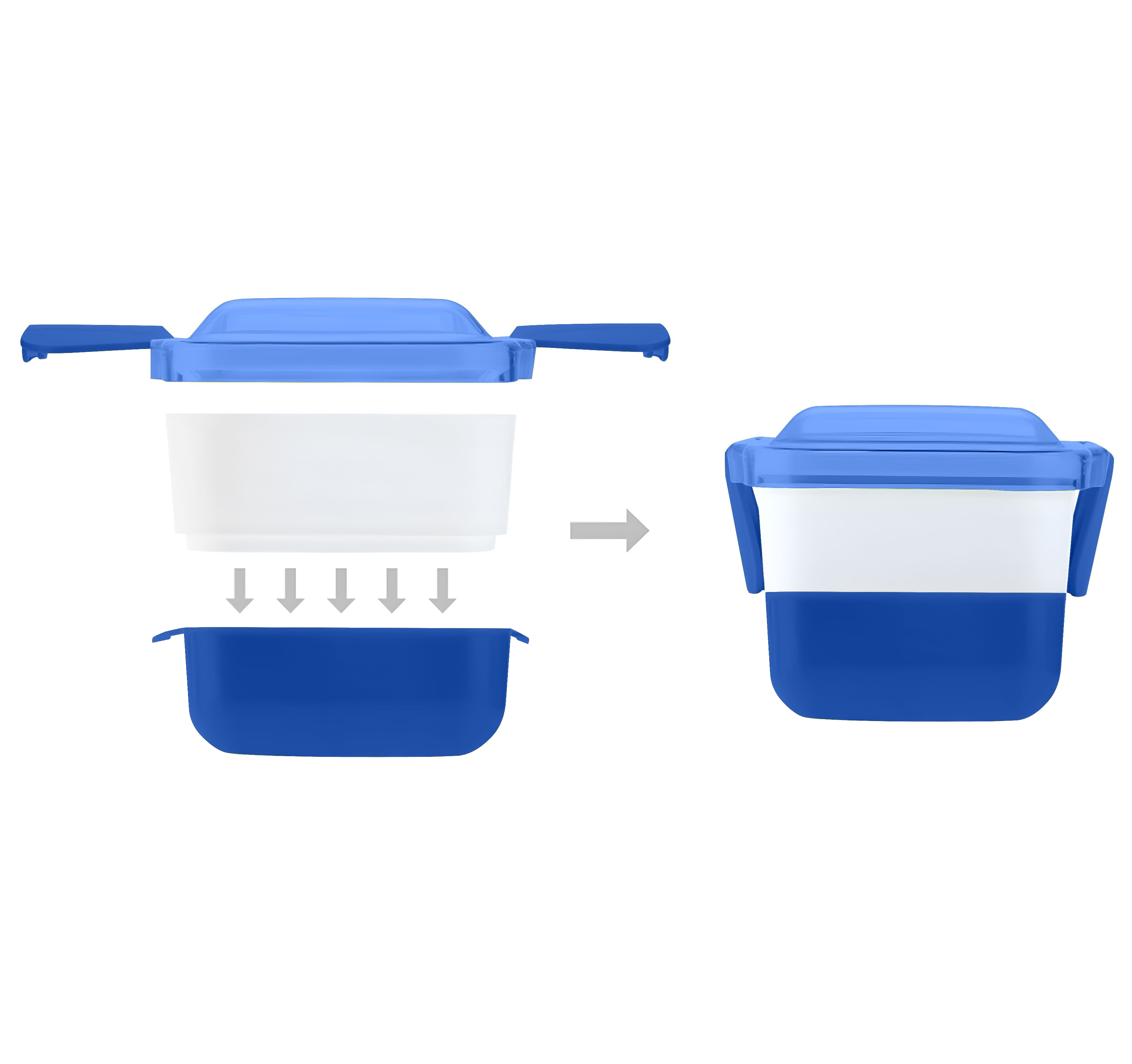 Ланчбокс складається з двох окремих контейнерів, що дозволяє зручно розділяти різні страви. Компактний дизайн у складеному вигляді робить його зручним для перенесення в сумці або рюкзаку, а збільшений об’єм у розкладеному вигляді забезпечує комфортне розміщення повноцінного обіду. Кришка не призначена для використання в мікрохвильовій печі.