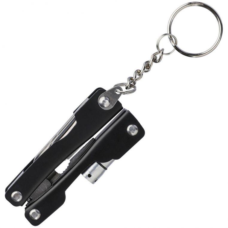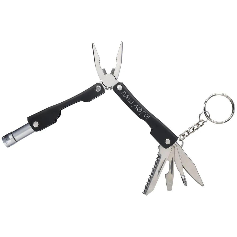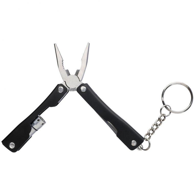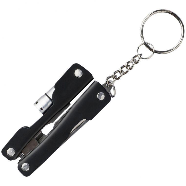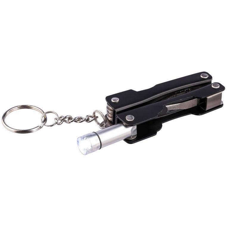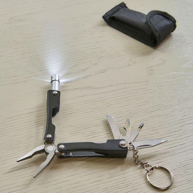 Багатофункціональний інструмент 10-в-1 з нержавіючої сталі. Мультитул оснащений кільцем для ключів. Наявний ліхтарик з 1 LED (батарейки входять до комплекту). Постачається в чохлі з поліестеру 600D із кріпленням для ременя.