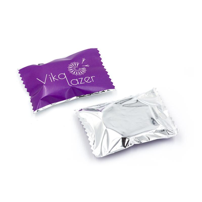 Печиво "Карамель в шоколаді" з логотипом (16 г) — це брендоване солодке частування із солоною карамеллю в чорному або молочному шоколаді. Продукт упакований в індивідуальний флоу-пак з поліпропілену, що дозволяє нанести повноколірний логотип. Ідеально підходить для корпоративних заходів та промо-акцій. Розмір упаковки — 71 х 62 мм, термін придатності — до 12 місяців.