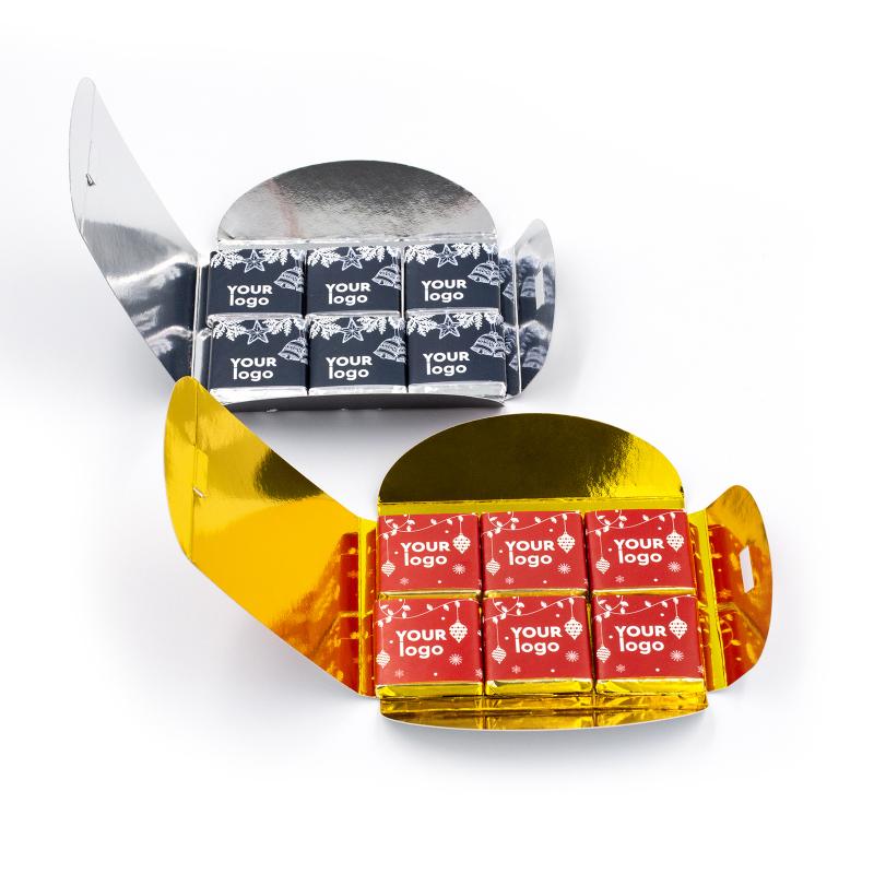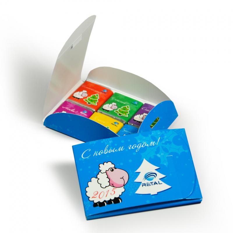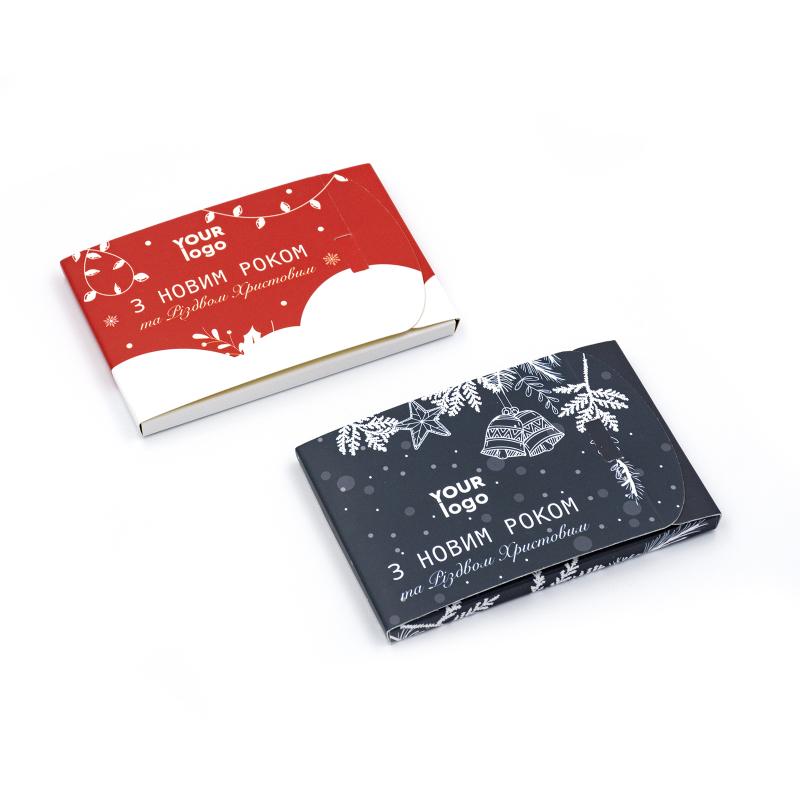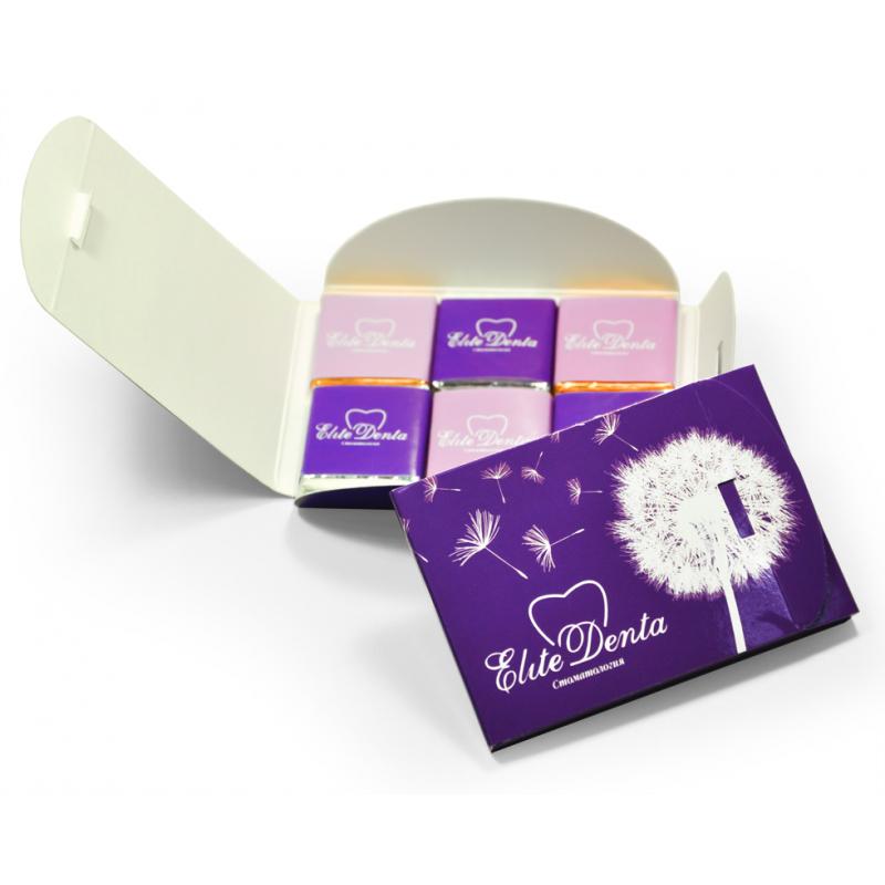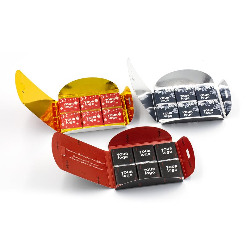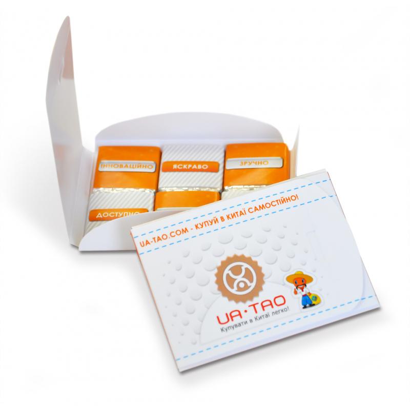 Маленькі шоколадки в стильній упаковці. Легко дарувати, займають мало місце. Зберігаються 10 місяців. Оформляйте заявку на сайт або дзвоніть у відділ продажу. Розрахуємо ціну, яка залежить від тиражу. В наявності: молочний, чорний, білий шоколад.
