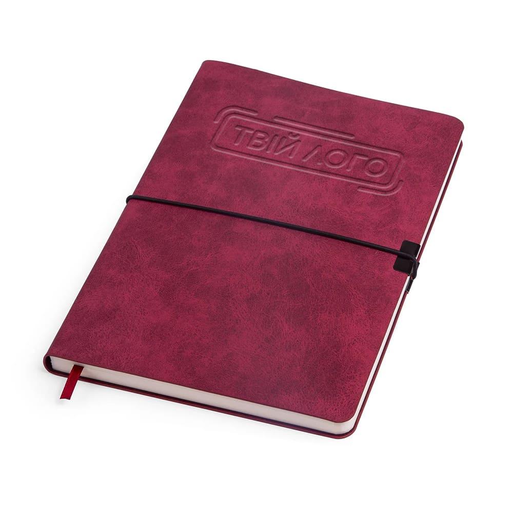 Записная книжка в мягком переплете, с фиксирующей резинкой и металлическим элементом. Кремовая бумага в линейку.