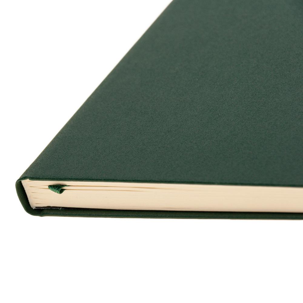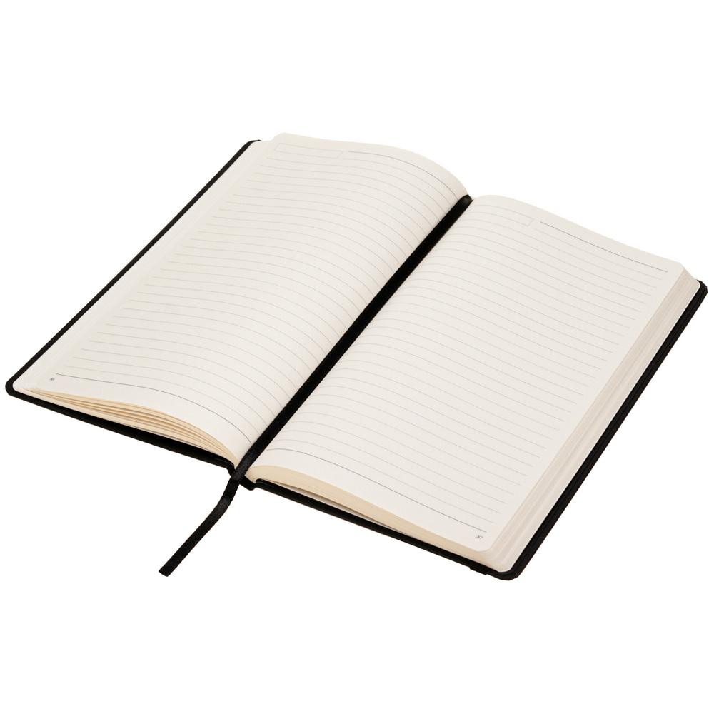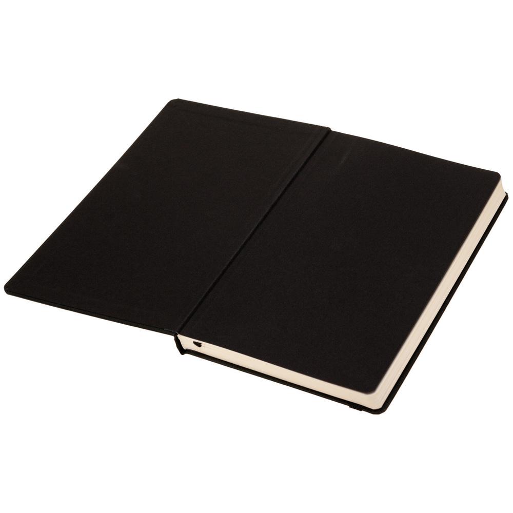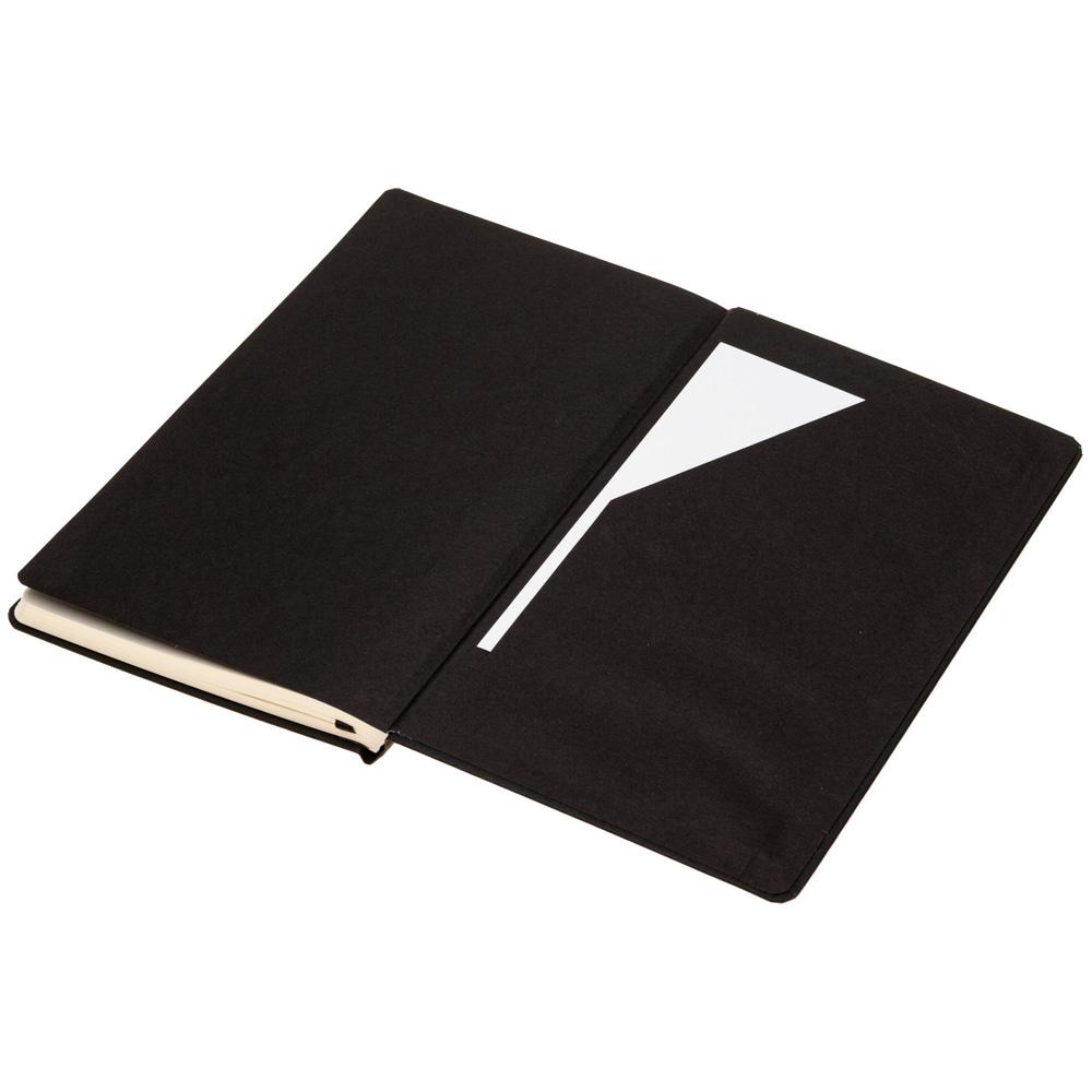 Обложка с закругленными углами. Резинка-фиксатор шириной 8 мм и ляссе выполнены в тон обложки. Форзацы из черной дизайнерской бумаги 140 г/м². На задней внутренней части обложки черный бумажный карман для бумаг и документов.