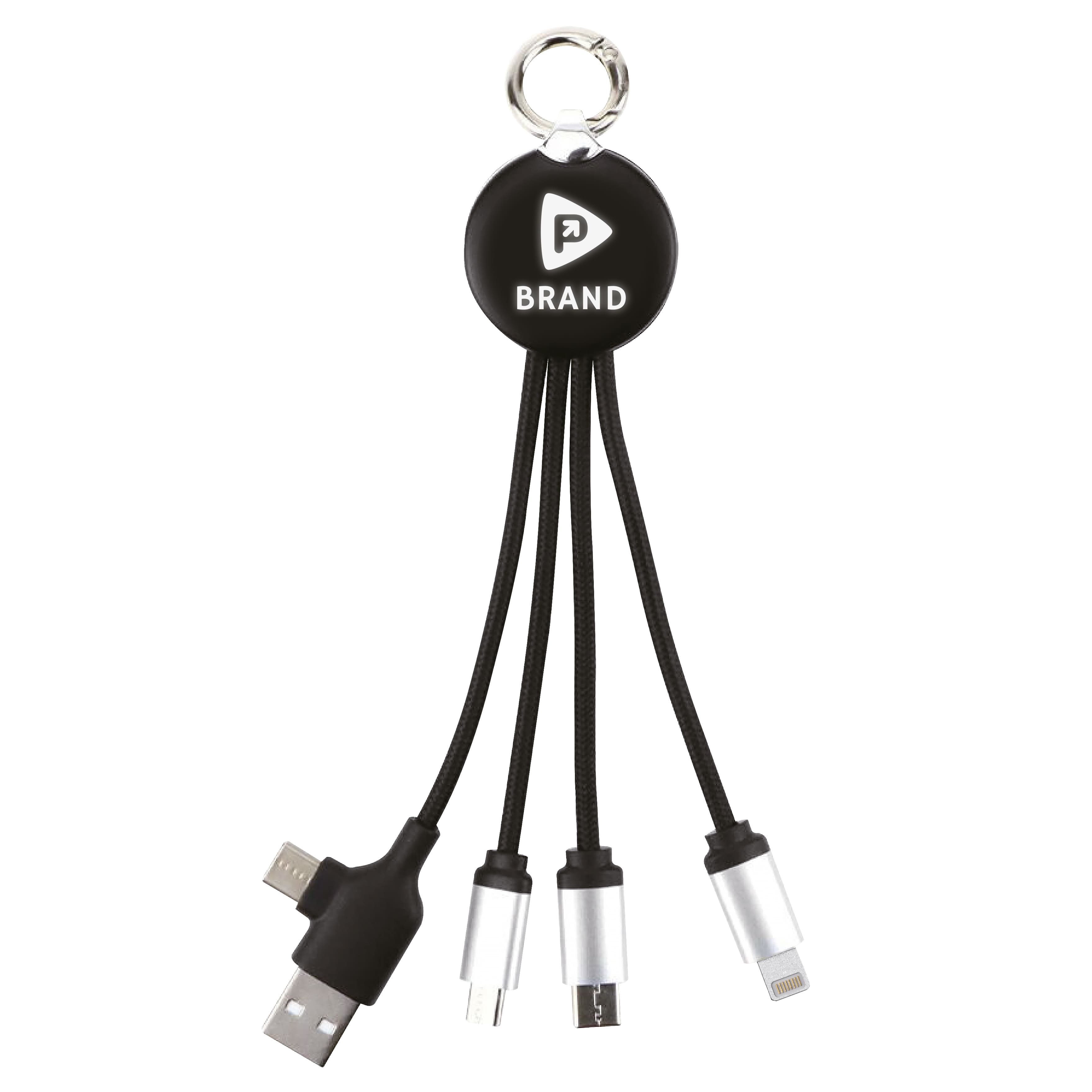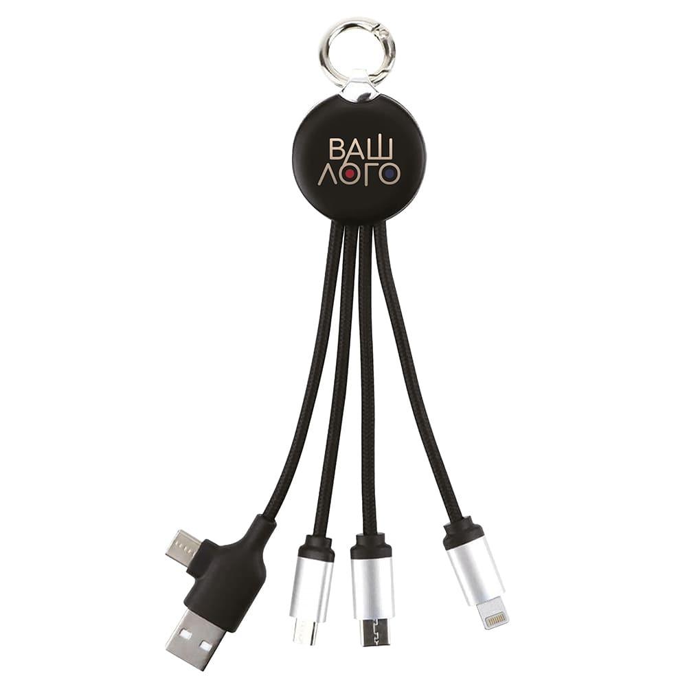 Универсальный кабель 4-в-1 для зарядки гаджетов с белой светодиодной панелью. Длина — 13,7 см. Оснащён стандартным USB-входом для подключения питания и тремя разными выходами: 2 Micro USB, Lightning и Type-C. При гравировке загорается подсветка логотипа. Гравировку можно сочетать с УФ-печатью.