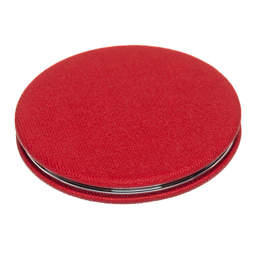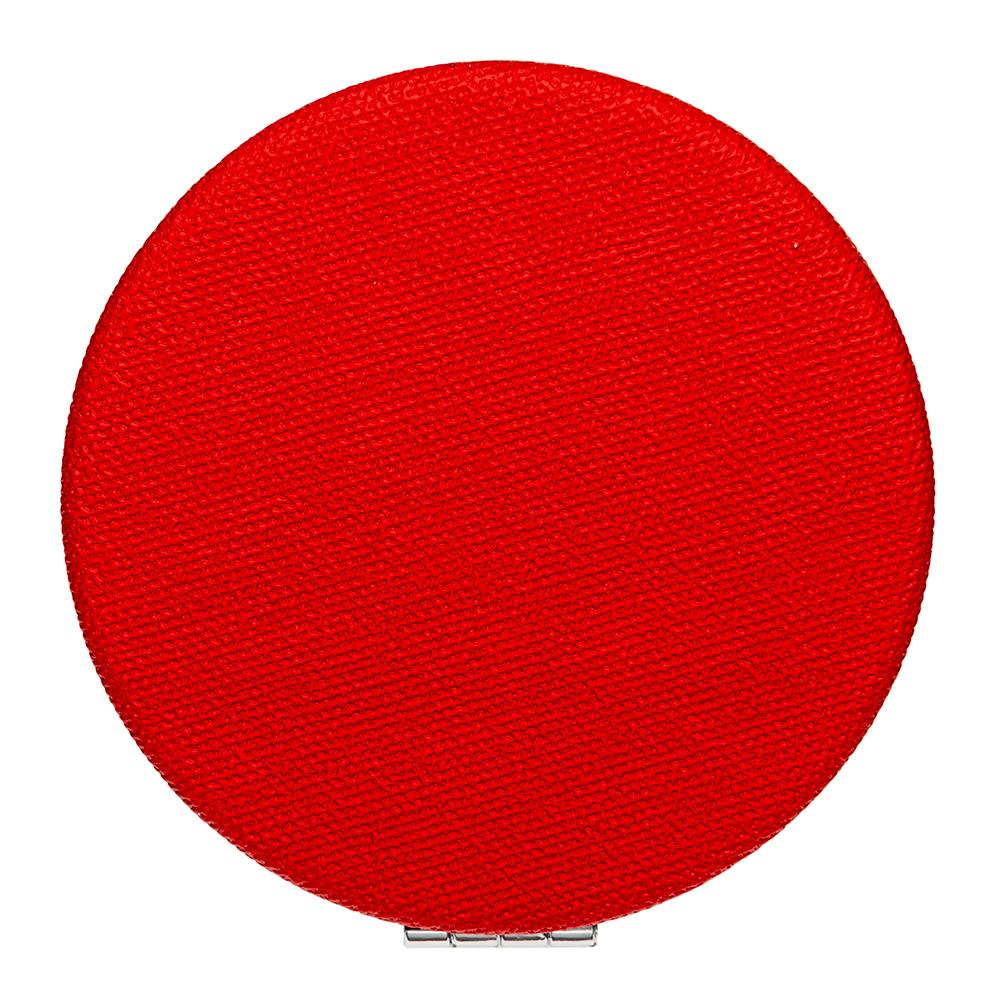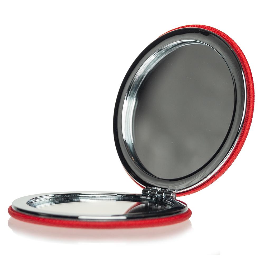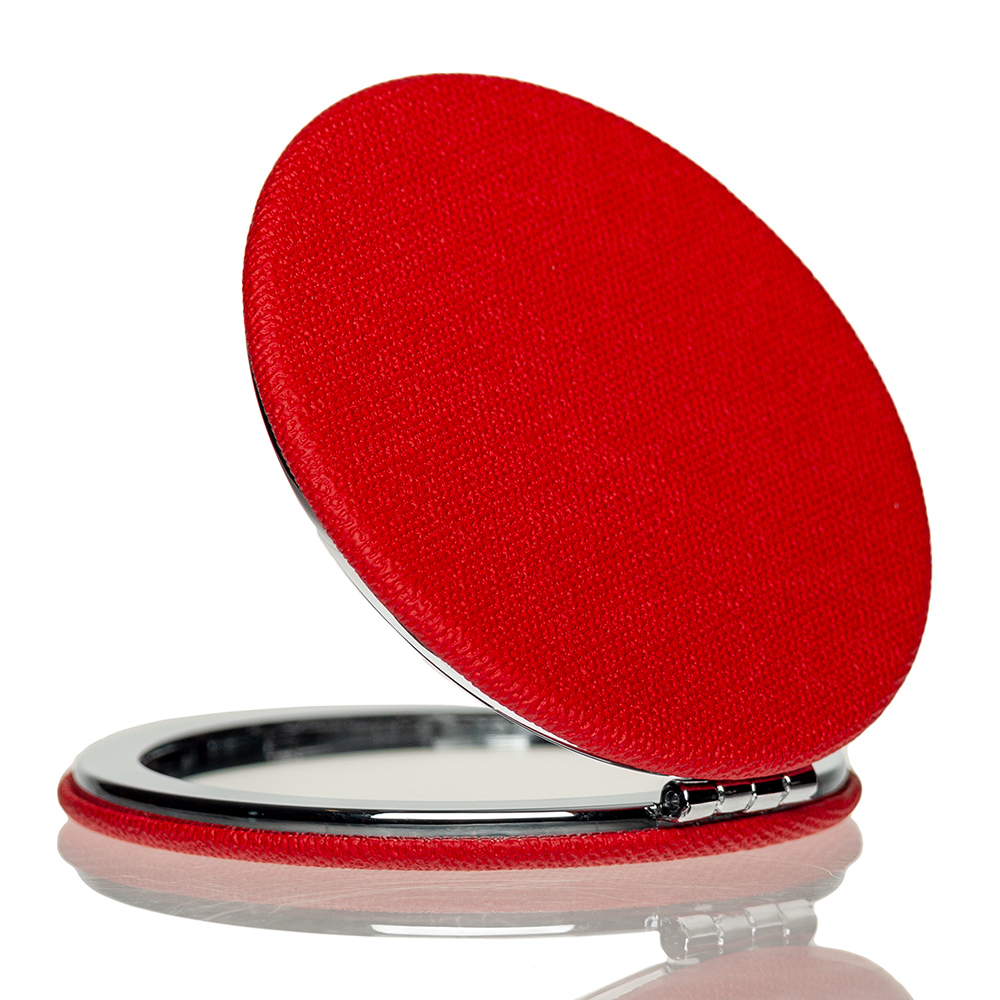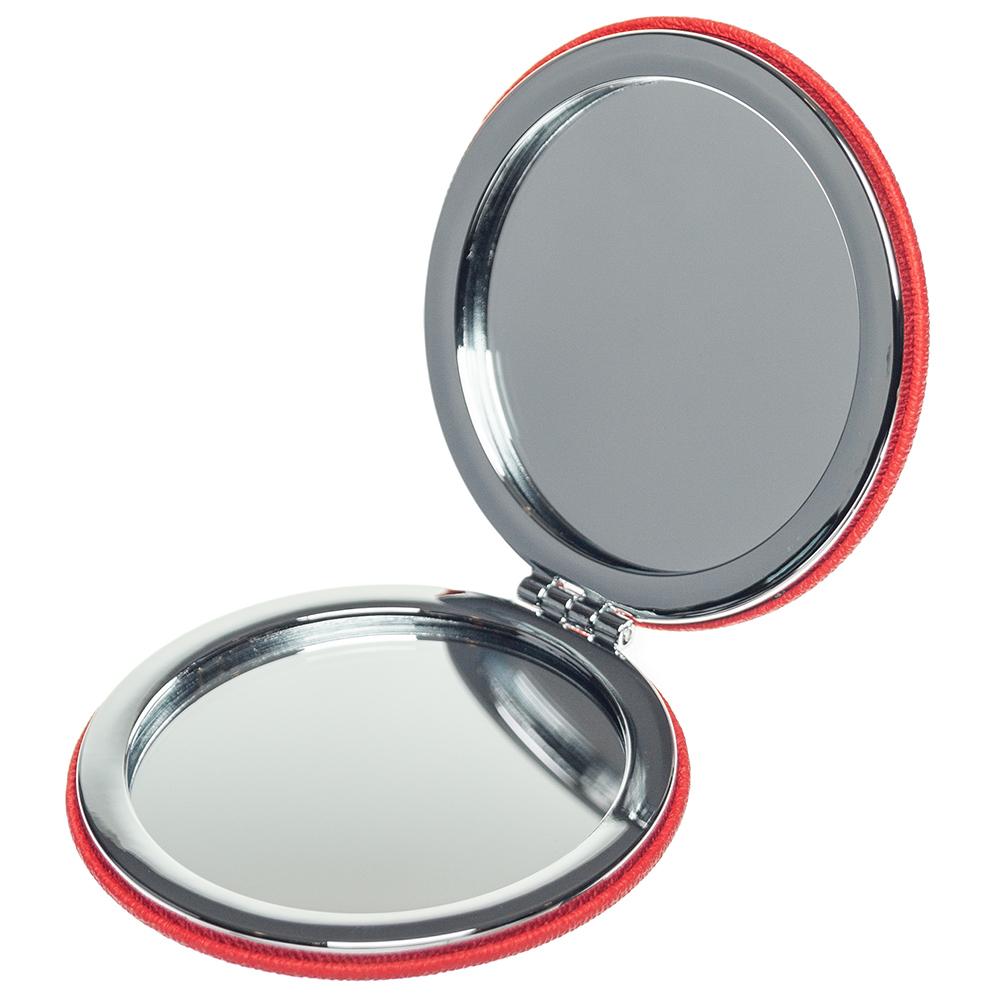 Косметическое зеркало двойное в круглом складном металлическом корпусе, внешняя сторона обшита искусственной кожей.