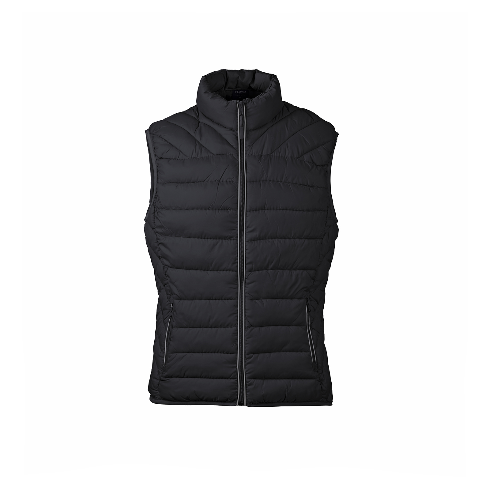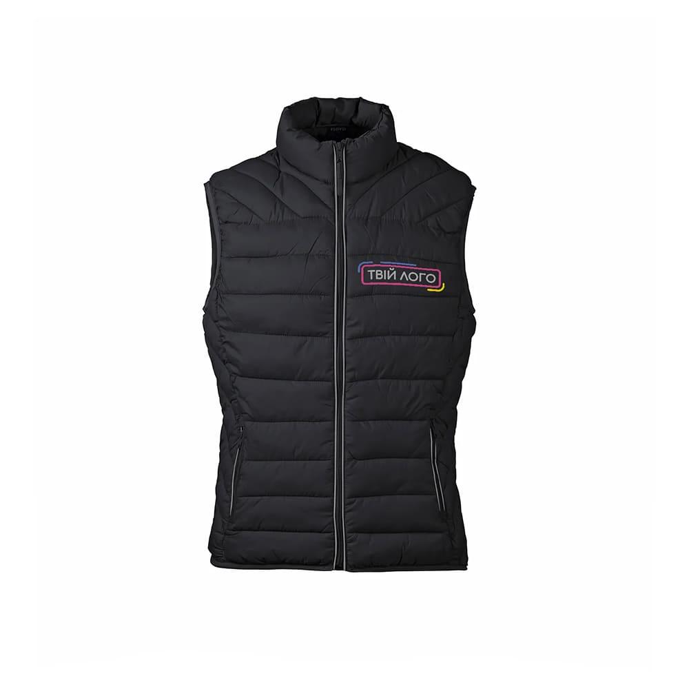 Жилет оснащен двумя внешними карманами для хранения необходимых мелочей. Воротник-стойка обеспечивает дополнительную защиту от холода, а светоотражающая лента над молнией улучшает видимость в темное время суток.