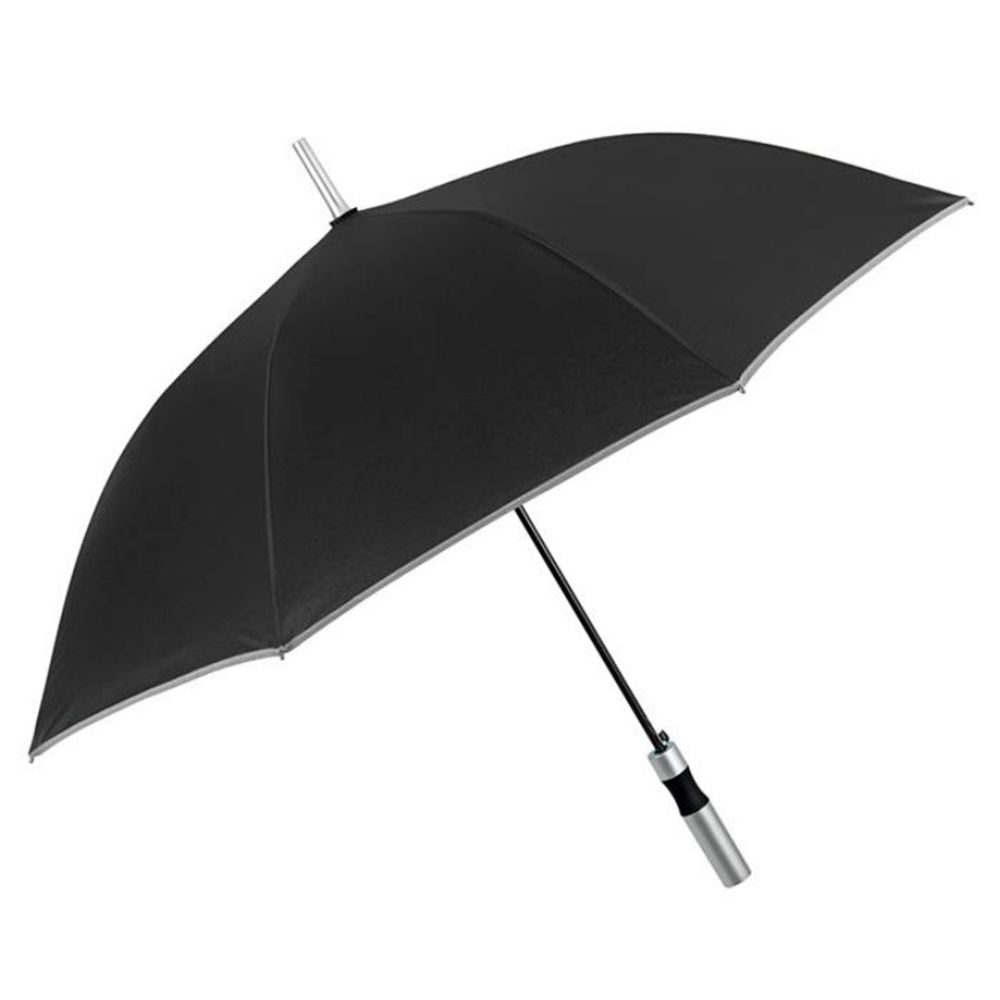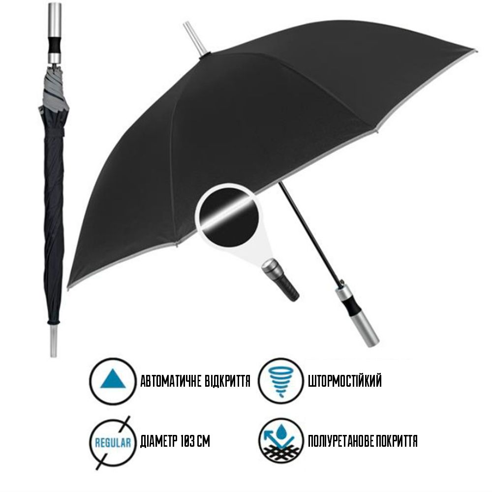 Особенность модели — светоотражающий кант по краю купола, повышающий безопасность в тёмное время суток. Зонт оснащён автоматическим открытием, что делает использование удобным даже одной рукой. Прямая пластиковая ручка матового серебристого цвета имеет эргономичную форму для комфортного держания.
