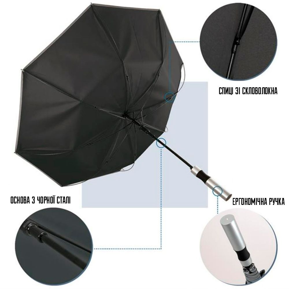 Конструкция выполнена из прочной черной стали с гибкими 8 спицами из стекловолокна, которые выдерживают сильные порывы ветра. Купол изготовлен из полиэстера pongee и микрофибры, которые быстро сохнут, не содержат вредных PFC и обладают повышенной водонепроницаемостью.